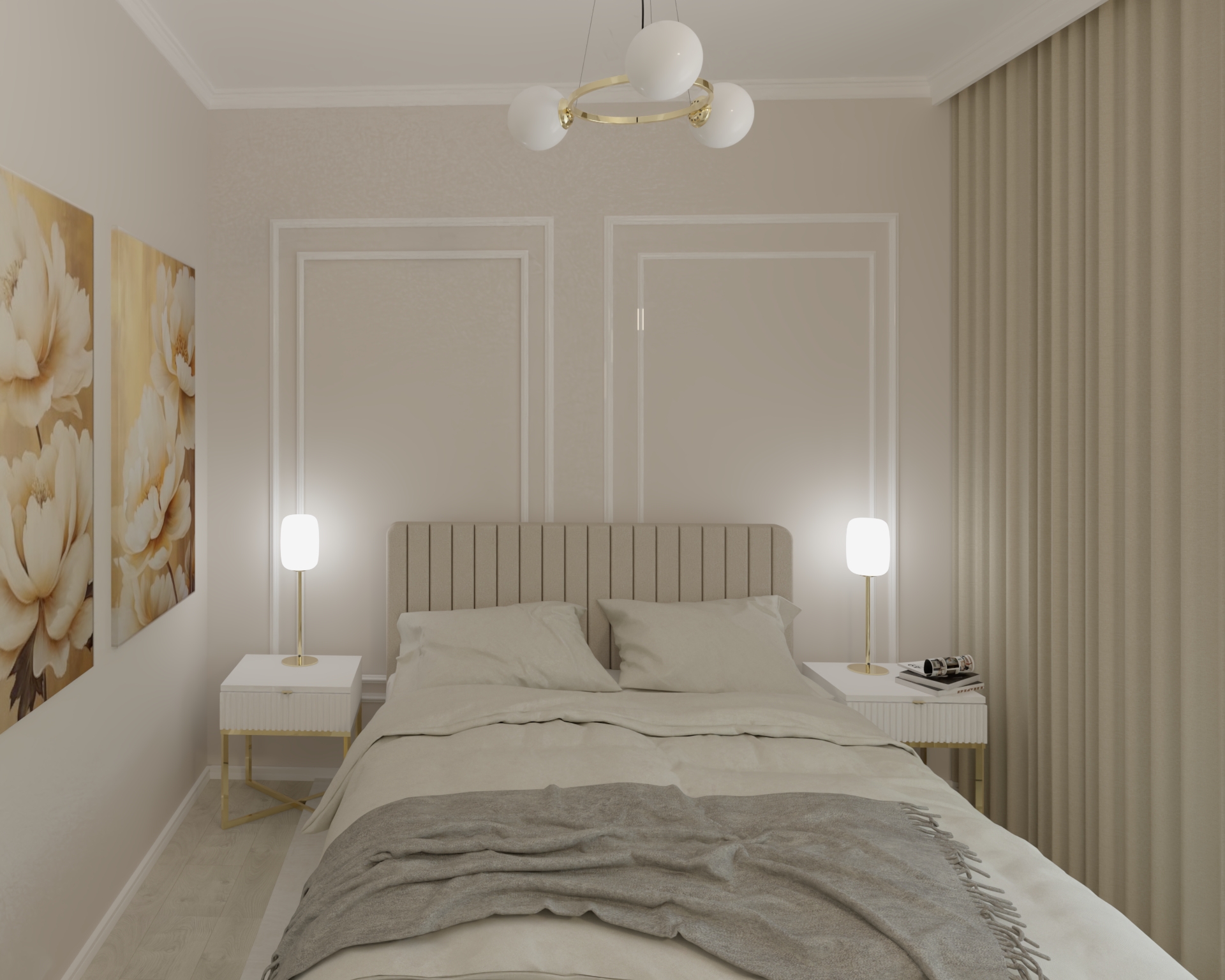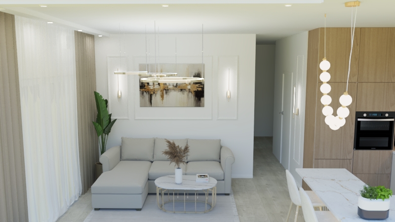 Eleganckie mieszkanie zaprojektowane w stylu modern classic to połączenie ponadczasowej klasyki z nowoczesną lekkością. Jasna kolorystyka optycznie powiększa przestrzeń i nadaje jej świeżości, a złote dodatki wprowadzają subtelny akcent luksusu.