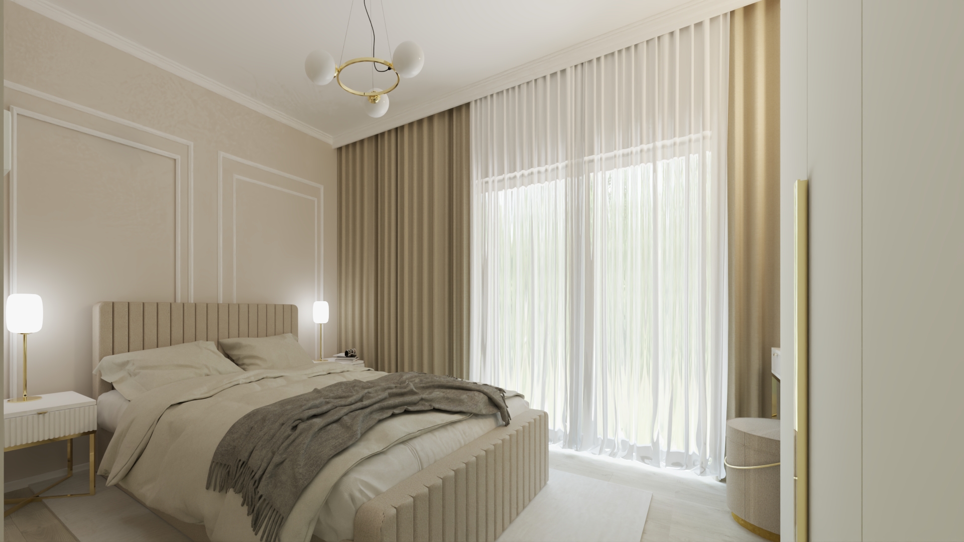 Dekoracyjna sztukateria podkreśla charakter wnętrza, nadając mu wyrafinowania i architektonicznej głębi. Całość tworzy harmonijną, spójną przestrzeń, w której estetyka łączy się z funkcjonalnością.