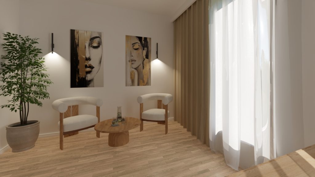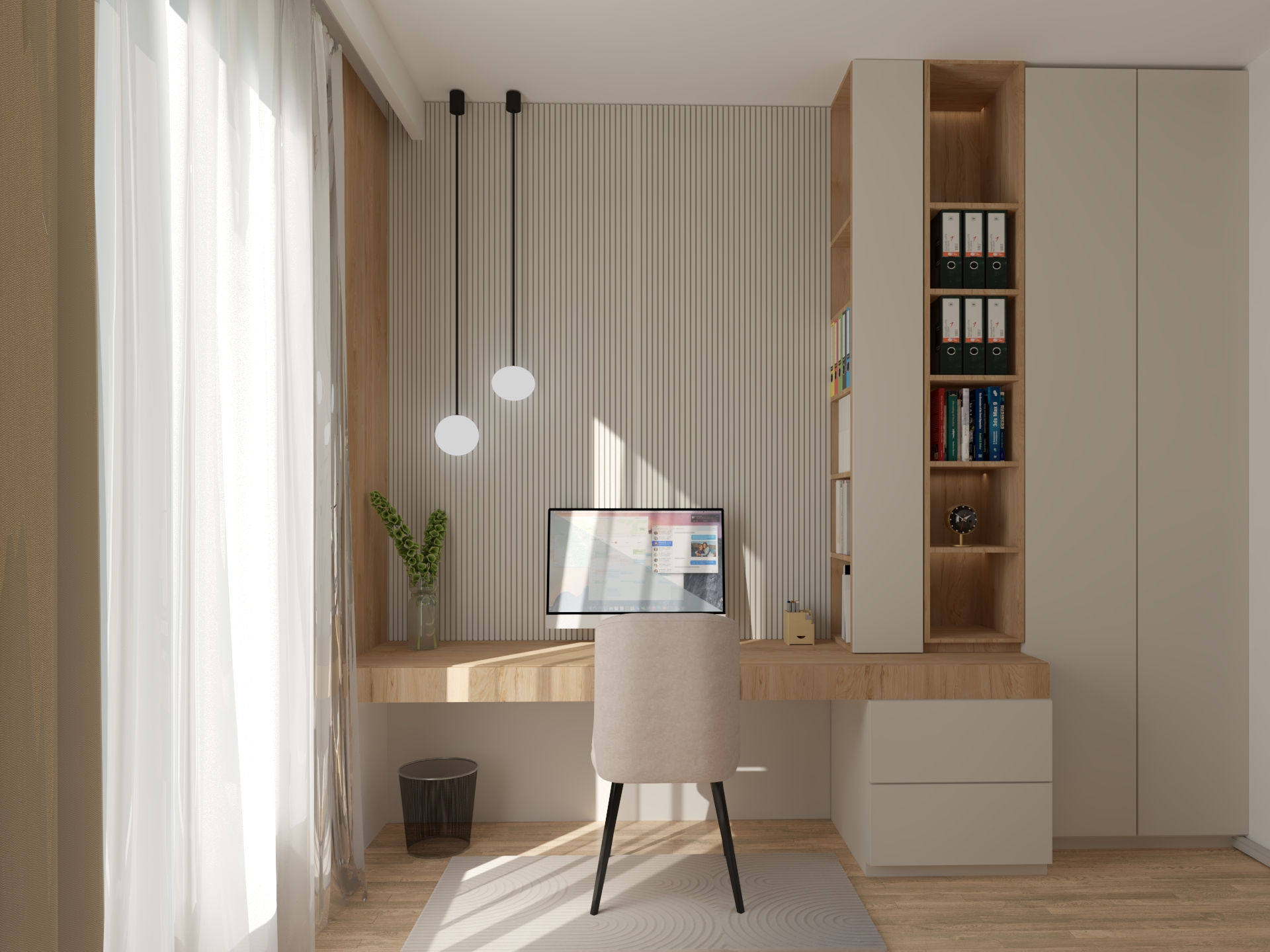 Prezentowana wizualizacja przedstawia nowoczesne biuro domowe (home office) zaprojektowane z myślą o ergonomii, funkcjonalności i estetyce. Jasna kolorystyka, naturalne drewno oraz minimalistyczne lamele ścienne tworzą elegancką i sprzyjającą koncentracji przestrzeń do pracy. Projekt obejmuje zabudowę meblową na wymiar z pojemnymi szafami i regałami, wygodne biurko oraz odpowiednio zaplanowane oświetlenie. Całość została zaprojektowana tak, aby maksymalnie wykorzystać dostępną przestrzeń. Zostało również wydzielone miejsce do siedzenia – dwa wygodne fotele i stolik kawowy, które tworzą kameralną strefę spotkań lub relaksu. To idealne rozwiązanie do rozmów z klientem, konsultacji lub chwili odpoczynku w ciągu dnia.