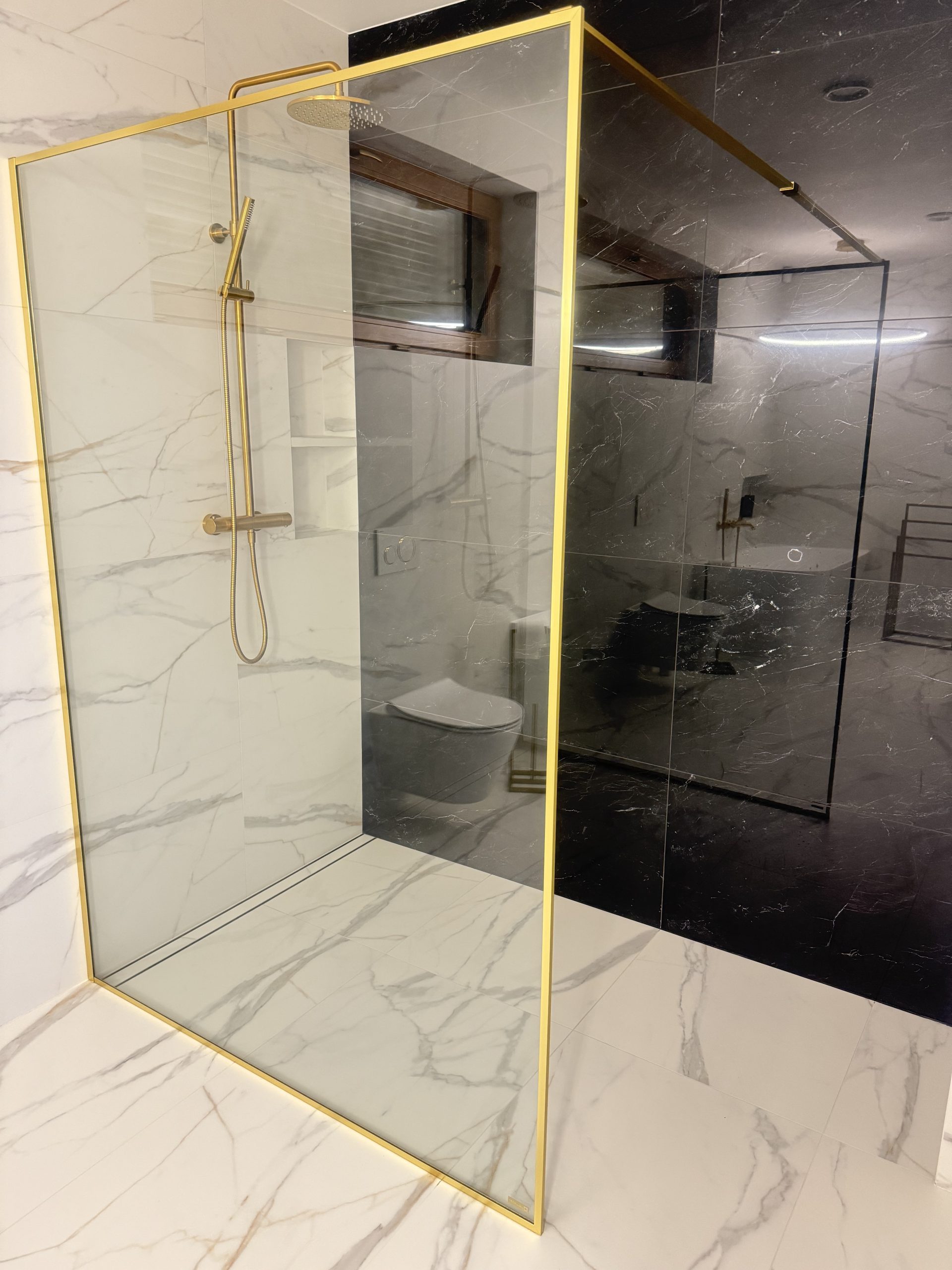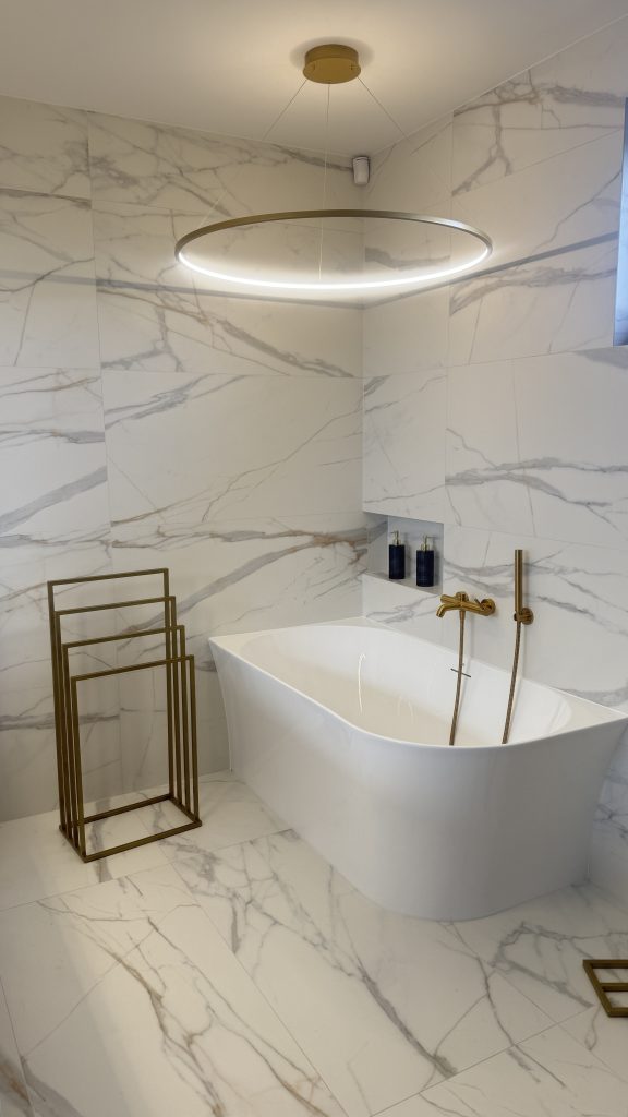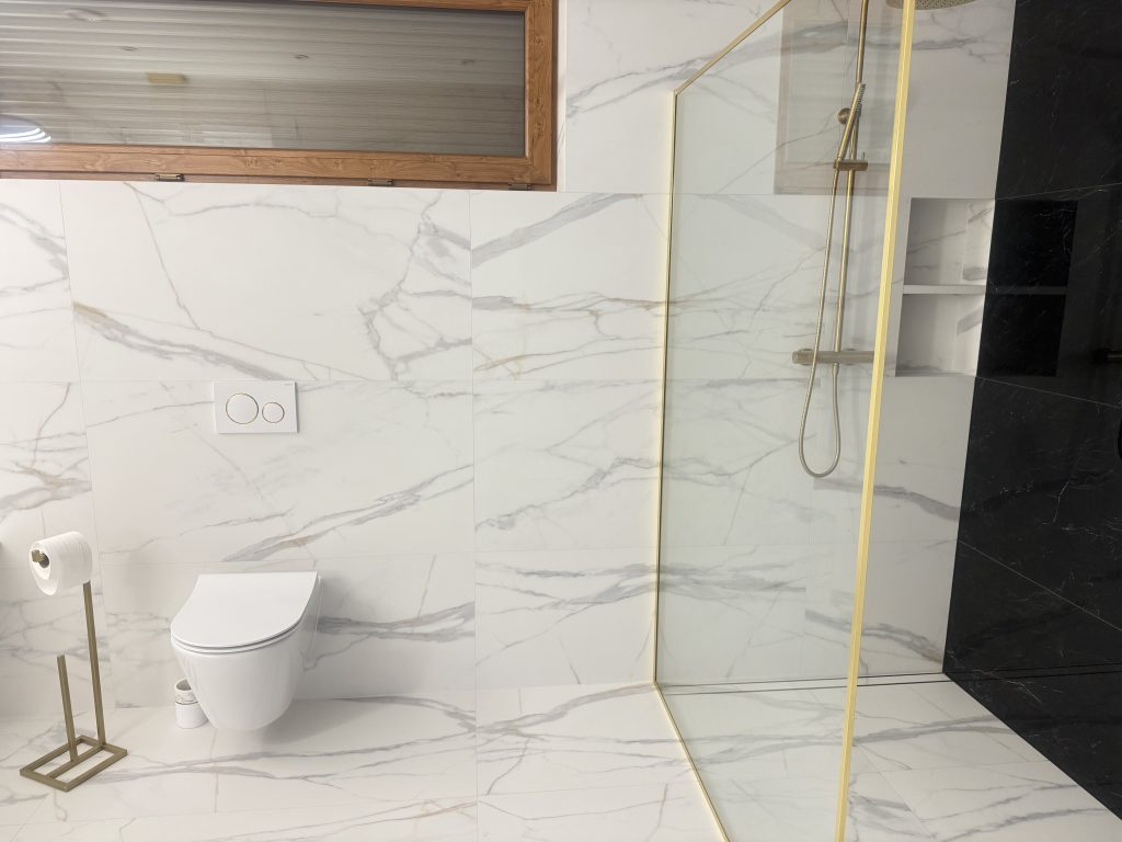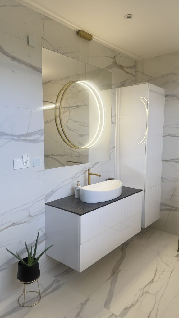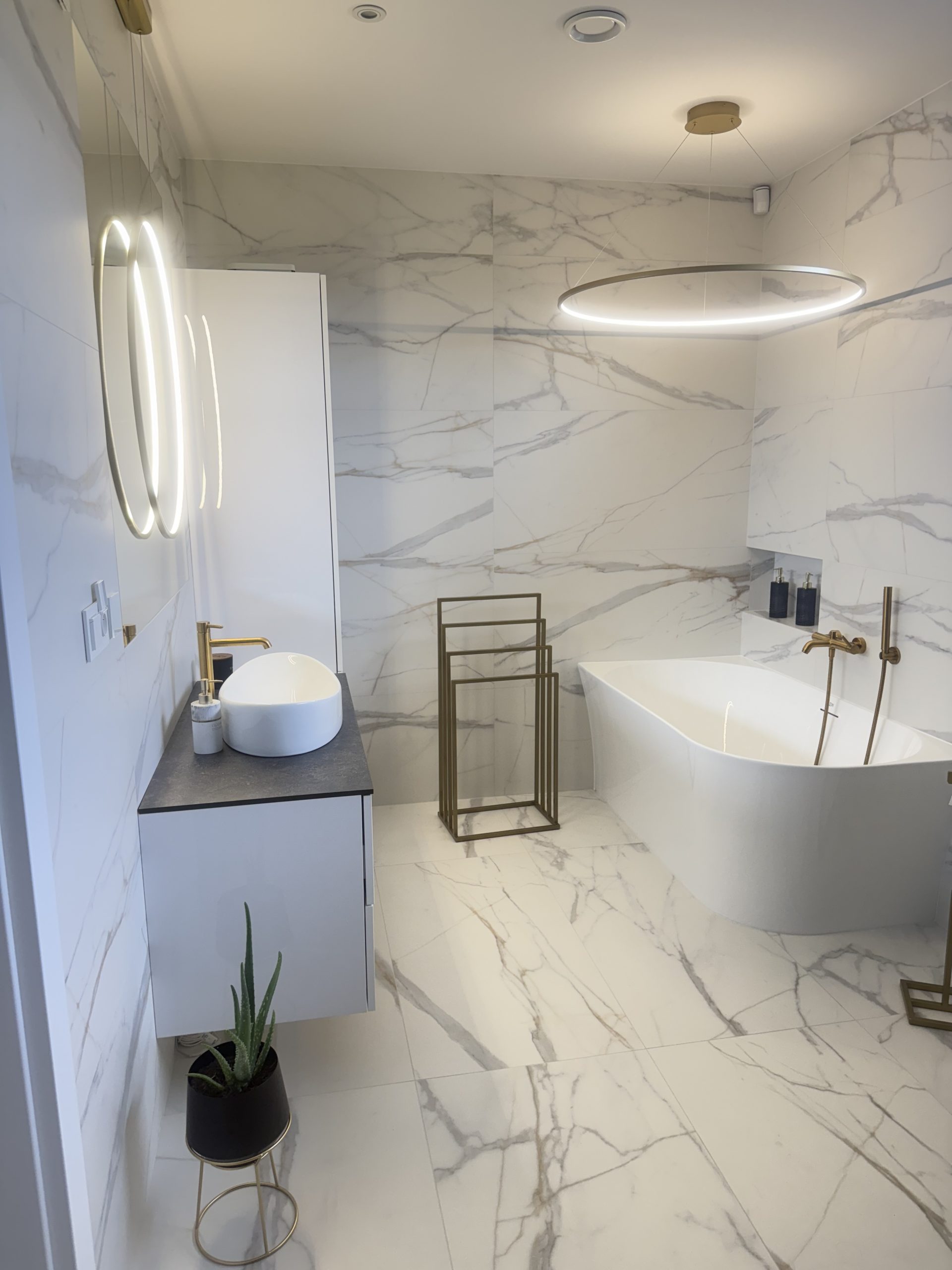 Całość tworzy spójną, harmonijną przestrzeń, w której nowoczesna łazienka ze złotą armaturą i marmurem Calacatta staje się miejscem codziennego komfortu i estetycznej przyjemności.