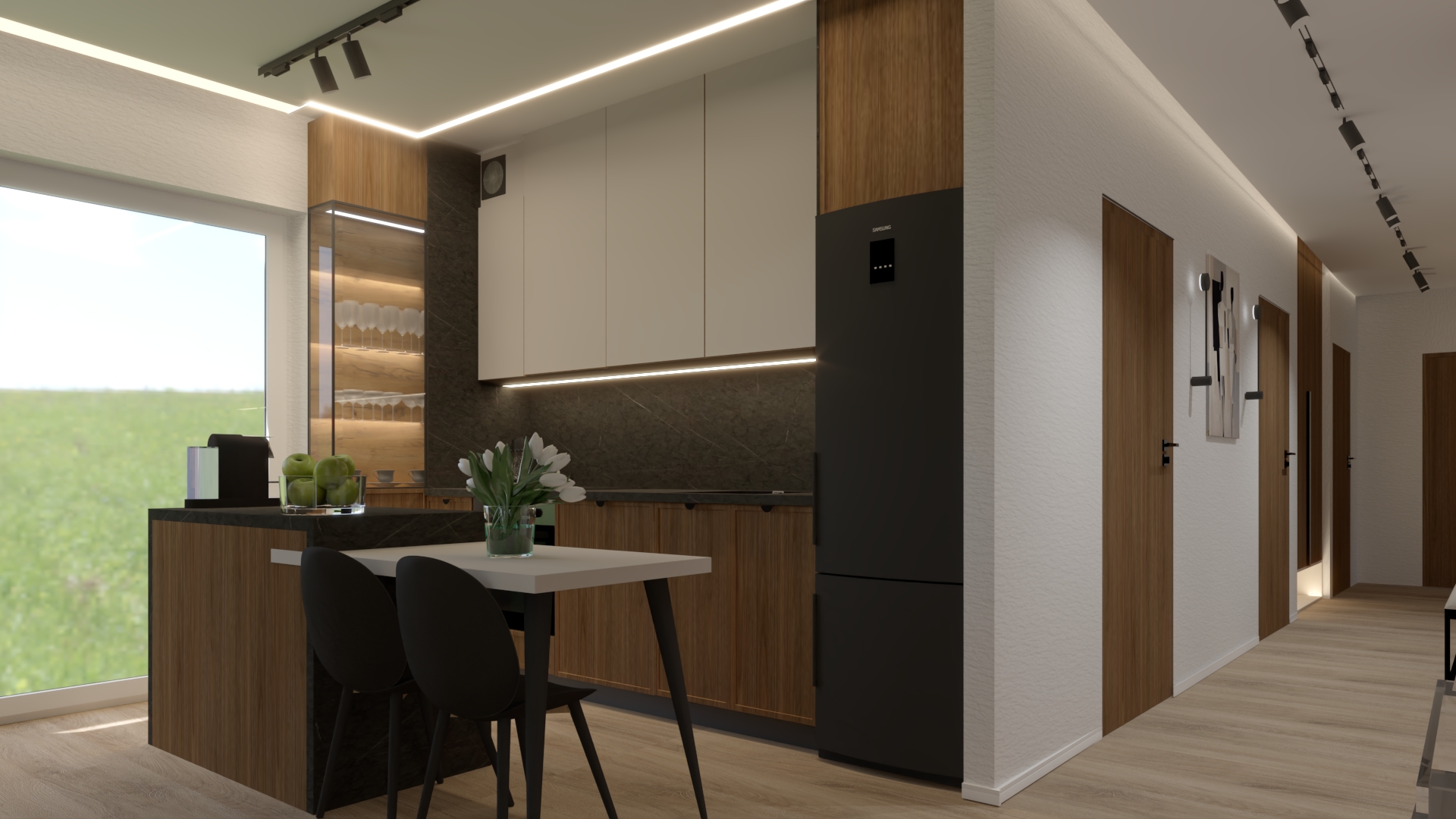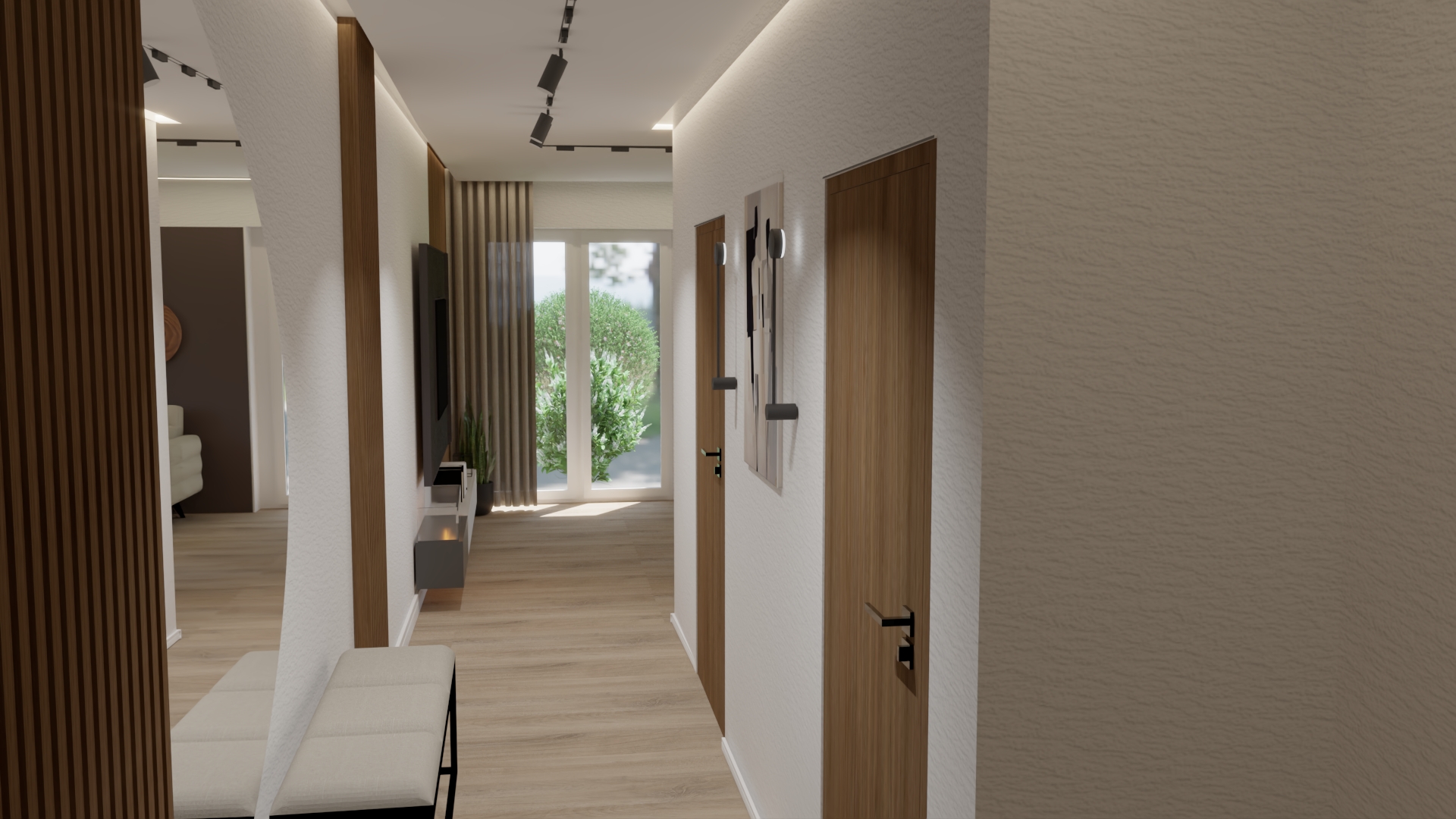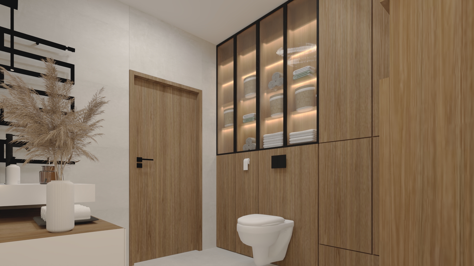 To projekt wnętrza mieszkania, który łączy ciepło drewnianych mebli z subtelnymi dodatkami w odcieniach beżu i szarości. Naturalne materiały nadają przestrzeni przytulności, a stonowana kolorystyka tworzy harmonijną, nowoczesną aranżację.