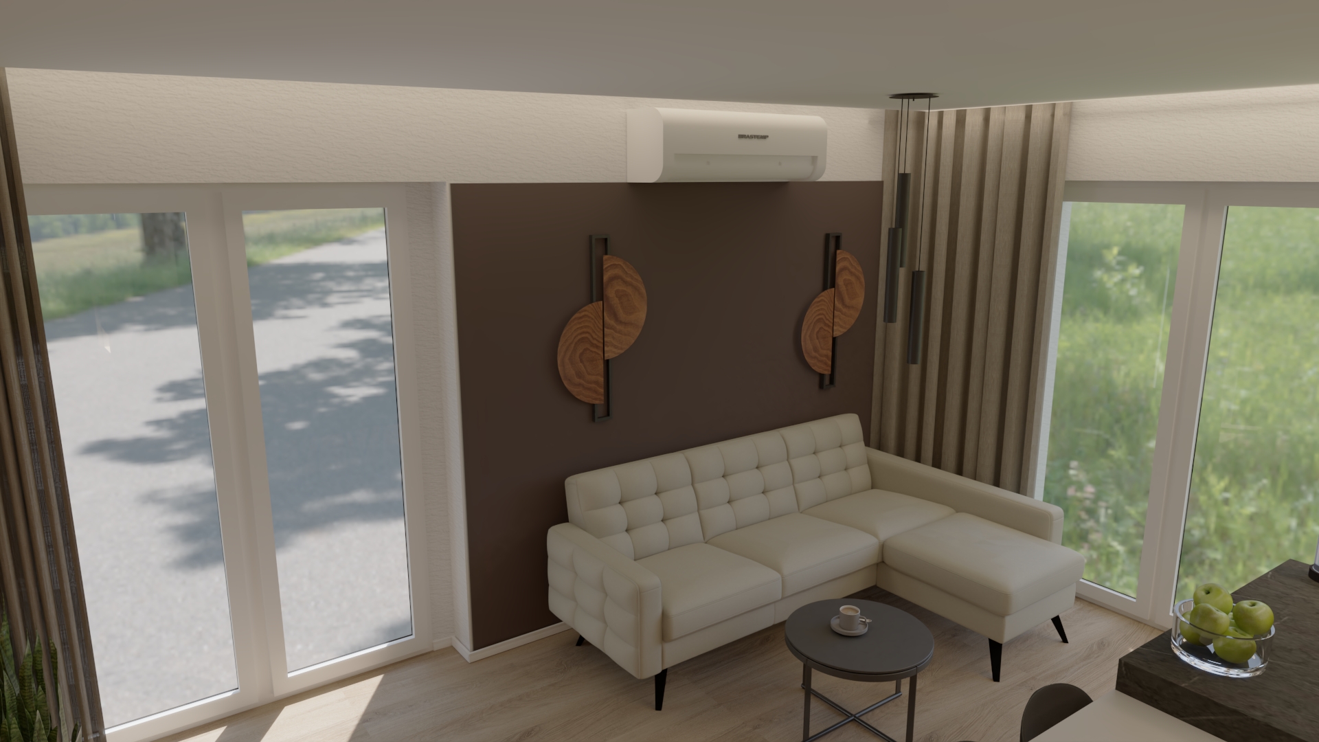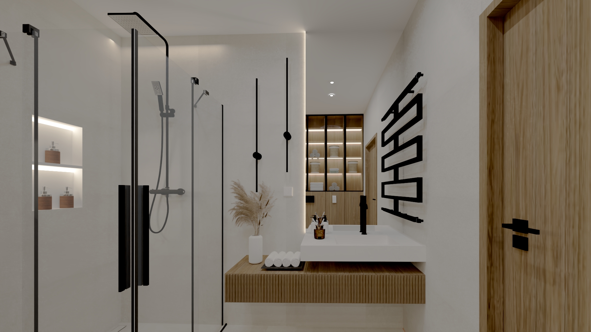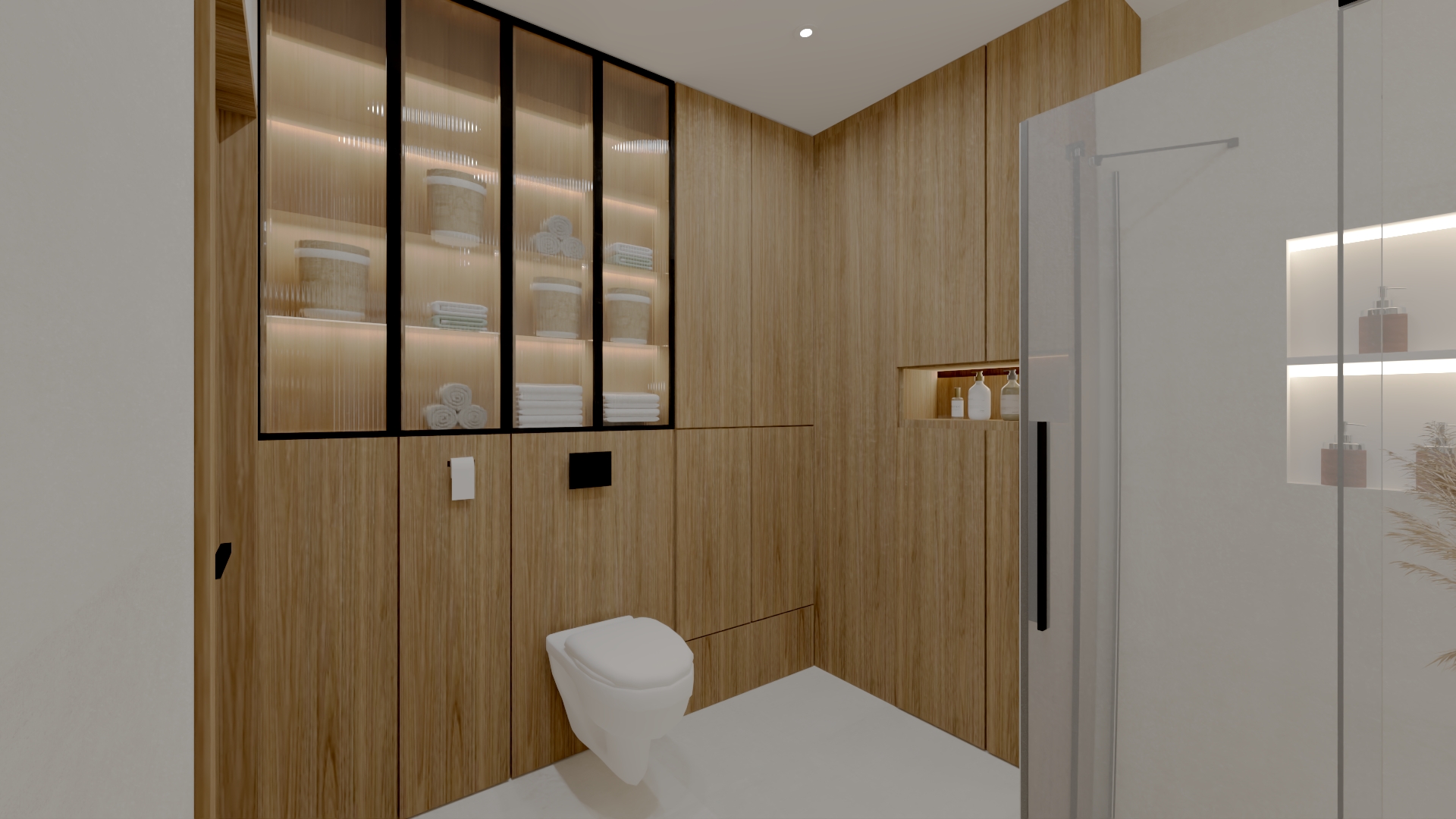 To projekt wnętrza mieszkania, który łączy ciepło drewnianych mebli z subtelnymi dodatkami w odcieniach beżu i szarości. Naturalne materiały nadają przestrzeni przytulności, a stonowana kolorystyka tworzy harmonijną, nowoczesną aranżację.